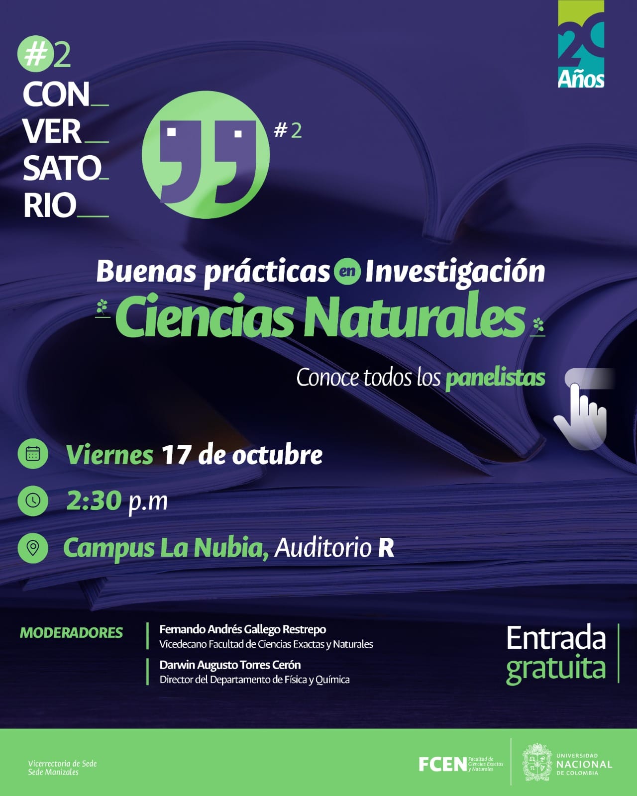 DESCRIPCIÓN: En el marco de la celebración de los 20 años de la Facultad de Ciencias Exactas y Naturales, se llevará a cabo un conversatorio sobre Buenas Prácticas en Investigación y Publicación, con la participación de panelistas de talla internacional en áreas como matemáticas, química, física e ingeniería. Este espacio busca reflexionar sobre la ética, la calidad y el impacto de la producción científica, compartiendo experiencias y recomendaciones para fortalecer los procesos de investigación en nuestra comunidad académica.